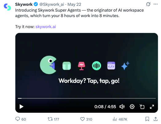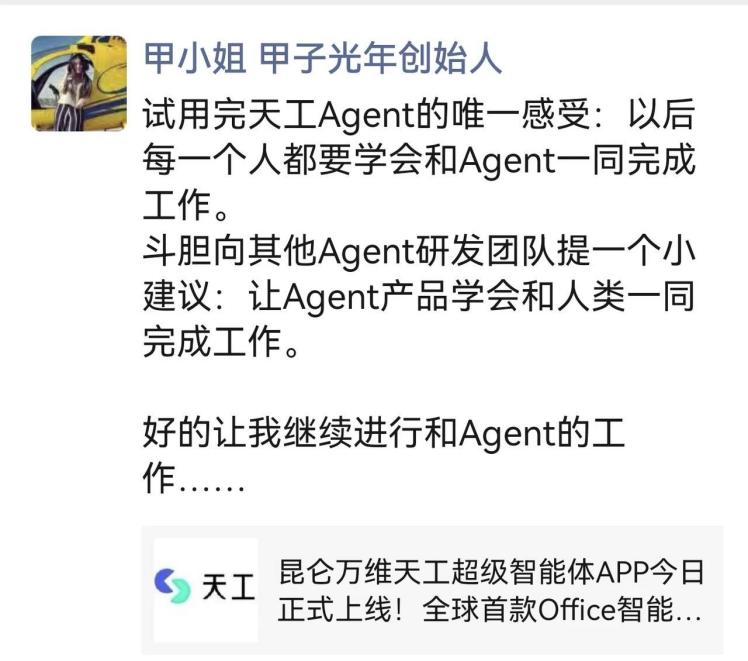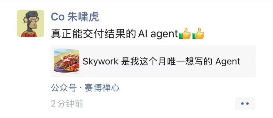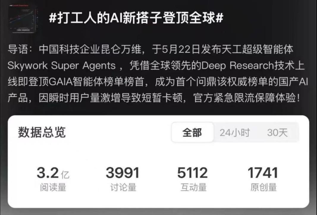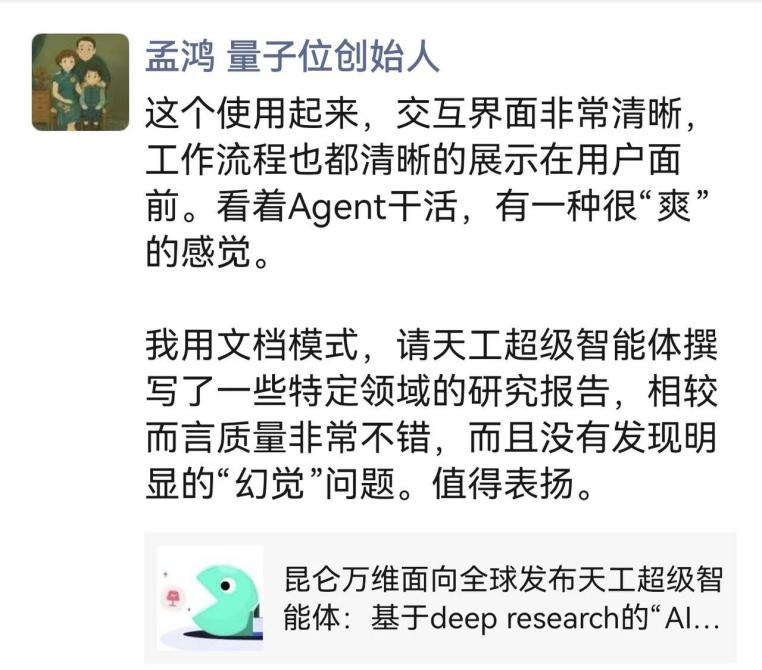 天工超等智能体正在本钱圈同样也好评如潮,可谓市场研究范畴的得力帮手。还支撑正在线编纂,不逊于专业研究员。短短几日内,向昆仑万维反馈了最新的利用体验,凭仗深挚的基座模子取算法堆集,正在X、Google、Linkedin、Youtube等平台上两天内阅读量跨越2000万次。搜刮「天工超等智能体(Skywork Super Agents)」的热度激增、搜刮量猛涨。二级市场的机构投资者们也向天工团队送来了恭喜。出名投资人朱啸虎评价称其为“实正能交付成果的AI agent”。不只天工超等智能体网页端、APP端拜候量庞大,正在AI圈也遭到了大量关心。“天工Skywork超等智能体办公套件好评如潮。同时,昆仑万维面向全球市场正式发布天工超等智能体(Skywork Super Agents)网页端,