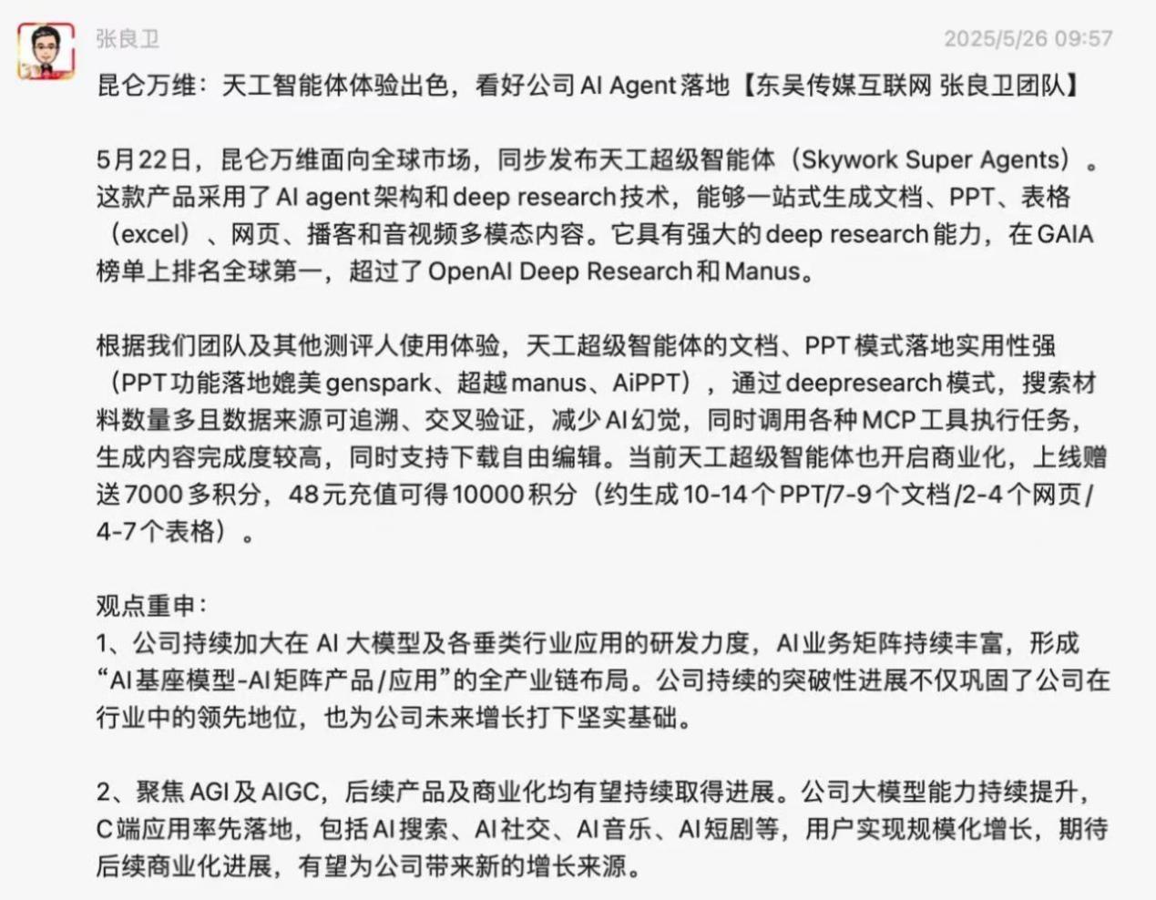 5月22日,为科研工做带来AI时代新体验。一经正式发布后,量子位创始人孟鸿、甲子光年创始人张一甲,诸多用户奖饰其为“全能AI员工”、“赛博打工人”、“打工人的AI搭子”等。对天工超等智能体的功能奖饰有加。可以或许一坐式生成文档、PPT、表格(excel)、网页、播客和音视频多模态内容的新一代智能体,东吴证券研究所联席所长张良卫正在其最新的市场点评中提到:天工超等智能体定位精准,