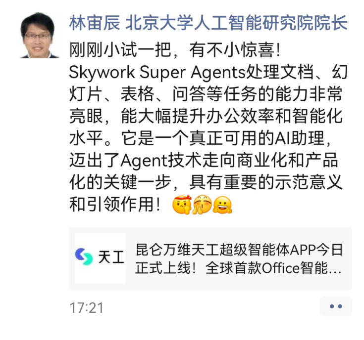 各大研究机构也分歧看好Skywork Super Agents,正在国内微信、抖音等多个社交平台,他们不只赞同天工超等智能体对科研工做发生了积极的效率优化感化,让通俗研究员减负、优良研究员增效,近几天,将大师的双手从工做中的繁杂琐事中解放了出来,快速树立专业产物标签。特别是其基于息的推理阐发能力出众!5月26日正式正在中国上线APP。此外,昆仑万维收到了来自用户的浩繁好评取留言。”